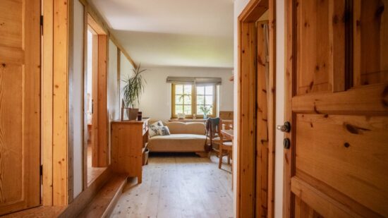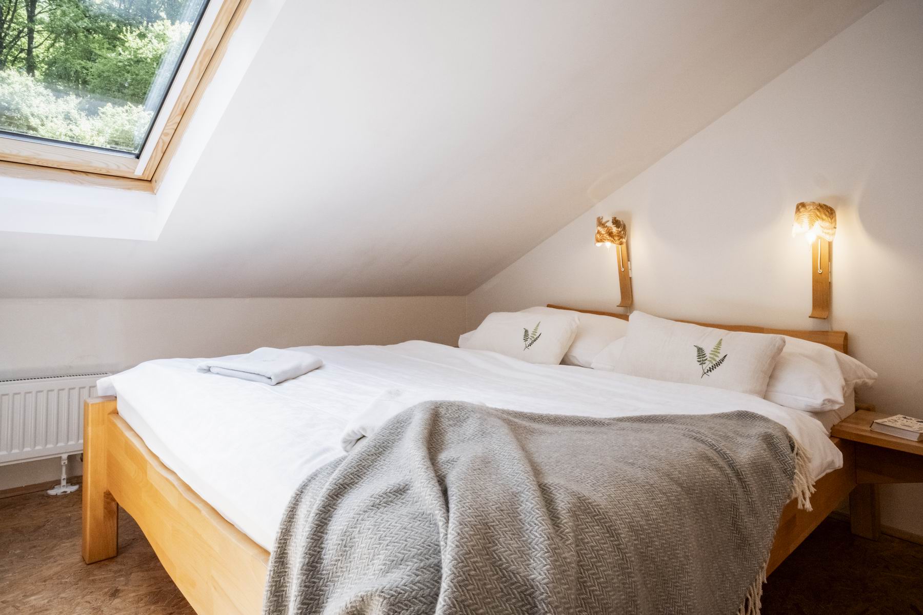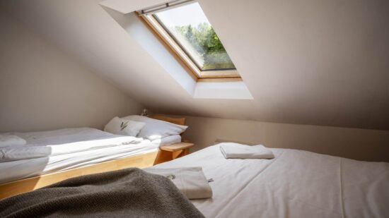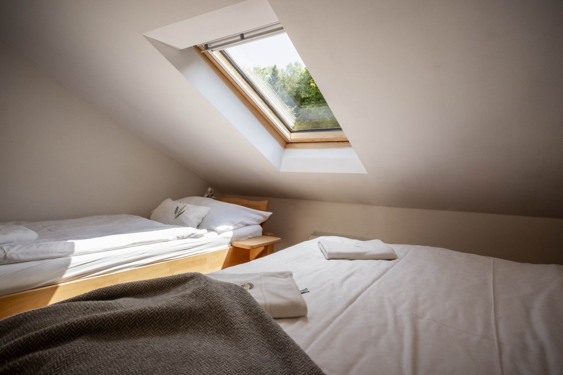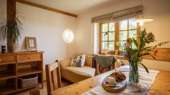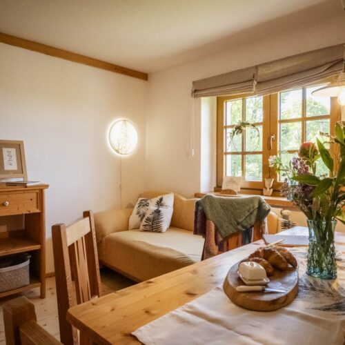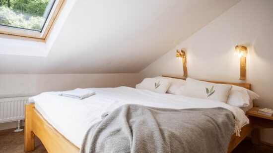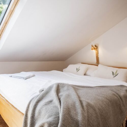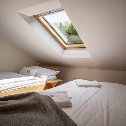 Stay comfortably in our largest apartment, which has two separate bedrooms with sloping ceilings, each with a double bed and one single bed (a total of 6 beds), a skylight with a view of the sky and an Indian dream catcher for your pleasant dreaming .. In the spacious living area with an equipped kitchenette you can sit at a large table or chair, put anything in a spacious chest of drawers. The separate bathroom has a shower, toilet. Private family wellness.
